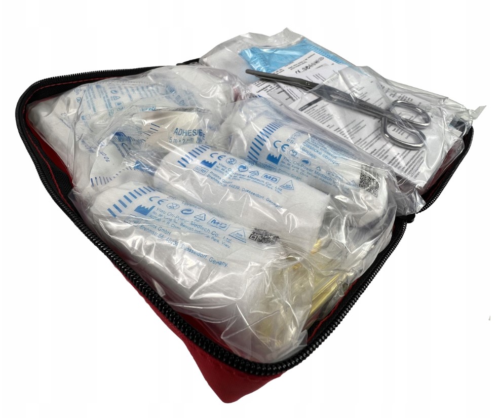 - Vključuje vse najpomembnejše pripomočke, kot so povoji, obliži, komprese, rokavice, škarje in termo odeja.