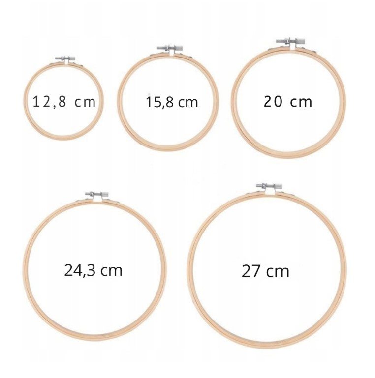 5 bambusovih obročev (tamborkov) v različnih velikostih: 12,8 cm • 15,8 cm • 20,1 cm • 24,3 cm • 27 cm Odlično se prilegajo vsakemu projektu – od majhnih motivov do večjih umetnin.