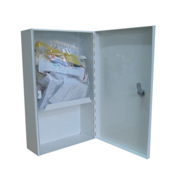Vse je pregledno shranjeno v robustni Omarici za Prvo Pomoč, ki omogoča hitro orientacijo tudi v stresnih situacijah.
