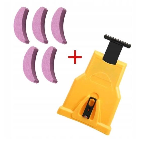 Komplet za brušenje: Komplet vsebuje vse, kar potrebujete za hitro in učinkovito brušenje. V paketu je vključena šablona za brušenje, 5 brusnih kamnov in sam pripomoček za brušenje verige, kar pomeni, da imate vse potrebno na dosegu roke.